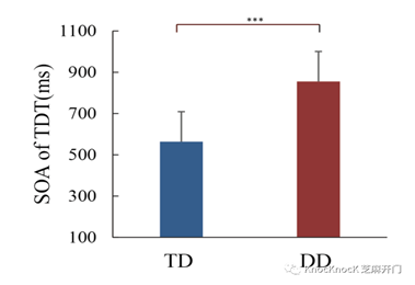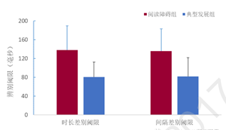 研究发现阅读障碍儿童在基本视觉加工上存在一定的困难,他们视觉辨别阈限显著长于阅读没有困难的同龄人(图1)(TD:典型发展组;DD:发展性阅读障碍组)。