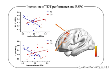 我们推测,阅读障碍者虽然有完好的固有功能连接,但他们不能很好地发挥该静息态功能连接(固有连接)的功能,帮助视知觉加工与阅读建立充分的联系,从而进一步发展阅读能力。