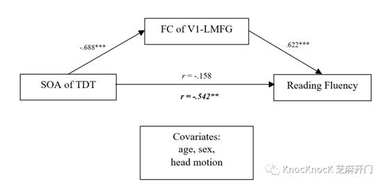 结果发现,阅读障碍儿童虽然在V1和大脑左侧额中回(LMFG)之间的功能连接强度上与典型发展组没有显著差异。但是,典型发展组V1和大脑左侧额中回(LMFG)之间的静息态功能连接与视知觉加工和阅读流畅性之间都存在显著相关,且 V1和大脑左侧MFG之间的静息态功能连接在视知觉加工和阅读流畅性之间的相关上起到显著的中介作用(图3、4、5)。但是这一现象并没有在阅读障碍组中出现(图3、4)。