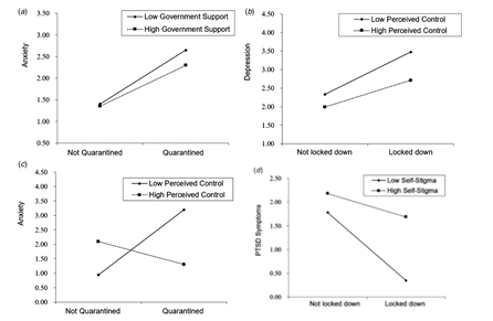 这项研究首次发现了外部资源因素之间的三次交互作用。随着政府支持的提高,封城与心理压力感的正相关关系逐渐减弱,从而为自我污名感在封城期引起的心理困扰提供了缓冲作用。这一结果表明,减少自我污名和加强政府支持可能是封城的重要保护机制。例如,自我肯定训练,可能是一个有希望的在线干预措施。