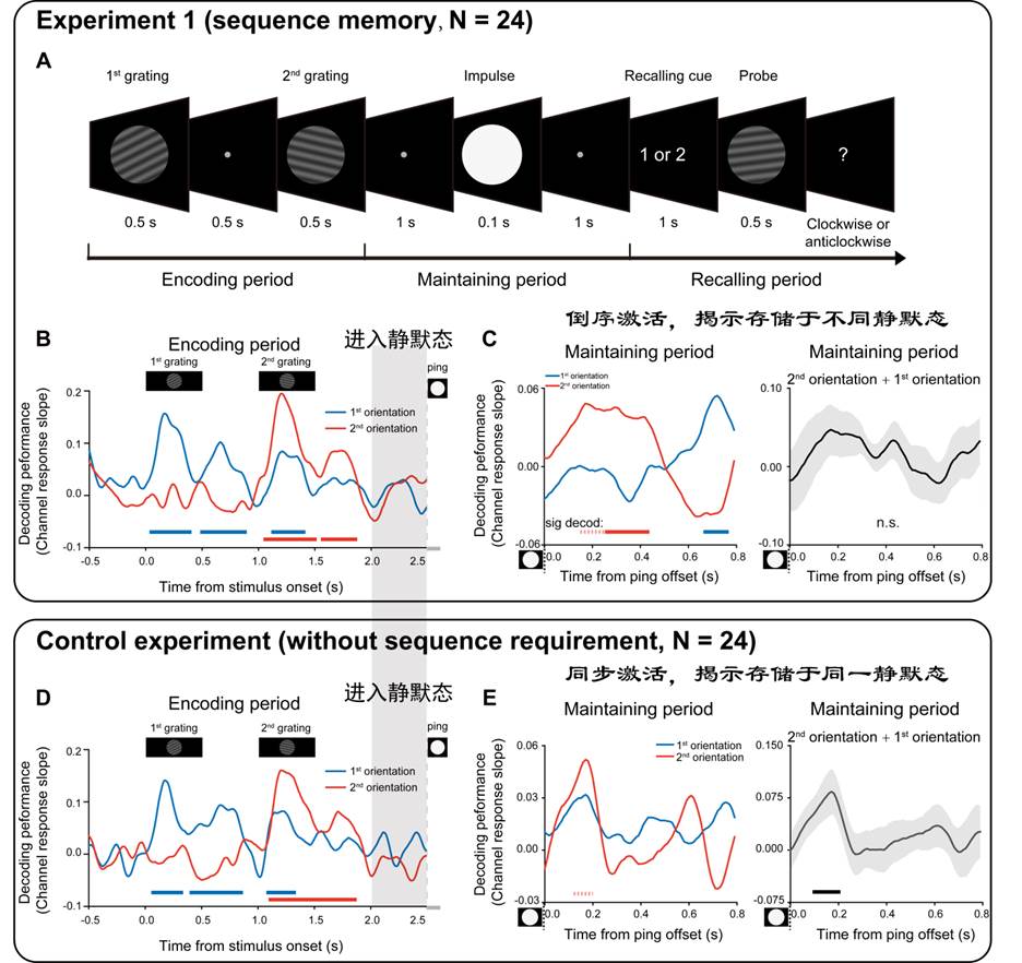 实验中,被试需要记住依次出现的两个光栅图案的朝向及其顺序。在光栅刺激消失后的保持阶段,通过呈现一个大白色光盘 (PING 刺激)对记忆网络进行暂时扰动,来探测这两个朝向信息的存储表征。结果发现,对网络的暂时扰动(PING刺激之后)激发出一种“逆向激活”模式,即位于序列后面位置的信息先激活,位于序列前面位置的信息后激活。进一步,该“逆向激活”模式和工作记忆行为中的“近因效应”直接相关。该结果表明,处于不同序列位置的记忆内容被存储在神经网络中的不同“隐藏态”中。