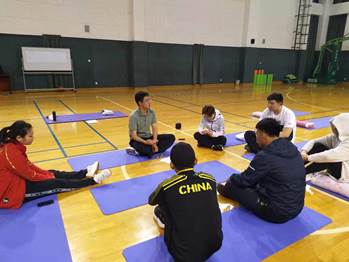 图:项目组贾坤老师(左二)正在给国家射击队进行正念训练,左一为姜冉馨。