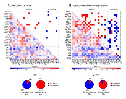 针对上述问题,王征实验室汇集了215例被试的临床和磁共振影像数据,包含有104例强迫症患者和82例健康对照,其中27例重度强迫症接受了毁损术治疗且在术后也进行了磁共振扫描;以及荷兰阿姆斯特丹大学合作者提供的15例健康对照和14例接受DBS治疗的强迫症患者数据。随后利用静息态功能磁共振影像数据构建了大尺度脑网络,建立基于主成分回归的机器学习模型,分析发现外侧前额叶皮层预测术前强迫症症状评分权重较大。手术前后的对照分析发现,毁损术和DBS对整个CSTC功能网络的作用都具有一种特殊的偏侧性,降低了皮层-皮层下的功能连接的同时却增强了皮层-皮层的功能连接(图一)。其中,86%的皮层-皮层下功能连接被DBS显著减弱,而100%的皮层-皮层功能连接被增强(图一A);92%的皮层-皮层下功能连接被毁损术显著减弱,而92%的皮层-皮层功能连接被显著增强(图一B)。