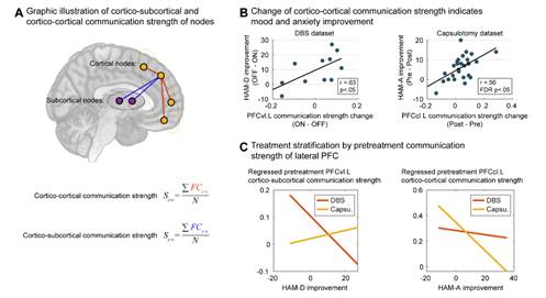 前期王征团队运用图论方法已发表过系列脑网络功能分析的成果(Biol Psychiatry, 2016; Cereb Cortex, 2018),这里选用通讯强度(communication strength)来解读皮层-皮层和皮层-皮层下的网络模式改变(图二A)。结果发现:DBS和毁损术都显著趋向于减弱皮层-皮层下,增强皮层-皮层的网络通讯强度。同时,DBS所导致的腹外侧前额叶皮层-皮层网络通讯强度的增强与患者的抑郁评分改善呈正相关;毁损术所导致的中外侧前额叶的皮层-皮层网络通讯强度增强与患者的焦虑评分改善呈正相关(图二B)。
