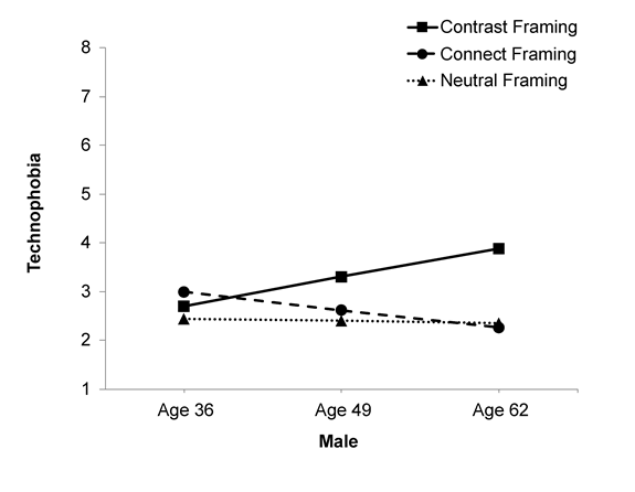 本研究具体关注了两种常见的科技代际对比方式:对立框架(contrast framing),即描述新一代技术颠覆了老一代技术;联结框架(connect framing),即描述新一代技术以老一代技术为基础。通过招募284名被试(年龄区间为37-83岁)并基于在线情景实验的方法,本研究发现技术代际的对比框架、年龄和性别对自我老化刻板印象激活(即自我老化感知)以及技术恐惧存在显著的三阶交互效应。具体来说,对立框架相比控制框架(即无科技代际对比)以及联结框架,激发中老年男性(49岁以上)更高的自我老化-社会心理损失感知,并进一步导致更高的科技恐惧。这一框架效应在年轻男性(49岁以下)以及女性群体中则不显著。