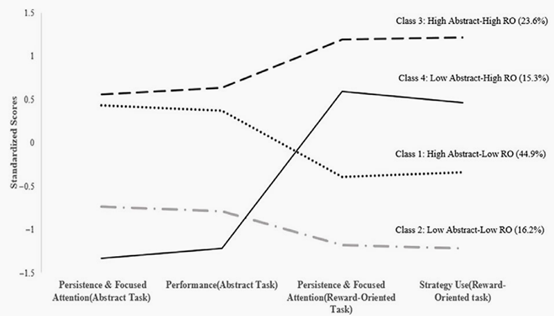 潜剖面分析表明根据儿童的任务表现、 投入以及注意力可将儿童问题解决能力划分为四种不同剖面:a)高抽象-低RO,(b)低抽象-低RO, (c)高抽象-高RO,(d)低抽象-高RO。环境风险对儿童问题解决能力的影响具体表现为:社区犯罪程度越严重,儿童划分到低抽象-高RO类别的可能性更大。母亲敏感性更高的儿童更有可能划分到高抽象-高RO类别。另外,与划分到低抽象-高RO类别的儿童相比,社区贫困程度更高的儿童更有可能划分到低抽象-低RO类别。儿童问题解决的剖面与一年后的儿童社会情绪功能相关:两种低抽象类别的儿童表现出更多的外化问题,但只有低抽象-低RO的儿童表现出更多的内化问题。该研究结果证明儿童问题解决能力可能存在(在不同情境中)的异质性,揭示处境不利儿童专门化的压力适应。