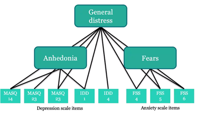本研究基于潜在因素模型,提取了抑郁和焦虑症状的共享与独特的三个症状特征,包括抑郁和焦虑共享的特征“一般痛苦”(General distress),焦虑独特的症状特征“恐惧”(Fears),以及抑郁独特的症状特征“快感缺失-忧虑”(Anhedonia-apprehension)。