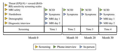 Fig.2 在跨越30个月的纵向追踪中,研究采集了4个时间点的临床症状量表测量,和基线及时间点4的恐惧条件学习功能磁共振成像测量。