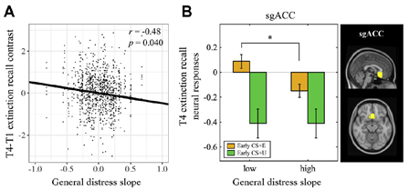 Fig.4(A)“一般痛苦”的斜率与未来30个月中消退回忆阶段的威胁相关神经通路的激活水平的变化(30个月 vs. 基线)呈负相关;(B)亚属前扣带回皮层(sgACC)体现出了最强的效应。