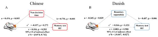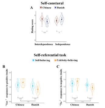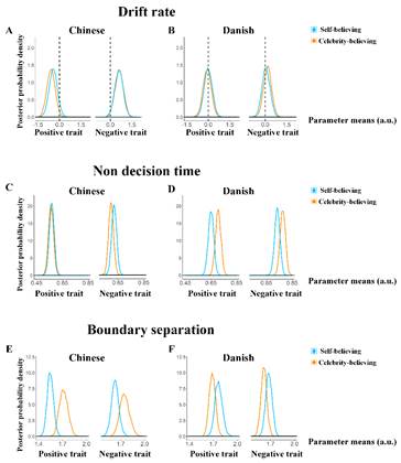 文化神经科学研究文化对大脑的认知和神经机制的影响。相信(believe)及信念(belief)是人类基本的心理活动之一,本研究结合功能磁共振脑成像技术和行为范式,比较东西方被试加工自我和他人人格特质信念的认知和神经机制的差异。实验招募了中国和丹麦老员工作为东西方文化下的样本,采用自我参照任务,要求被试判断是否相信人格特质形容词(如勇敢或粗鲁)可以用来描述自我或者他人(一名被人熟知的运动员)。行为结果表明,中国被试对人格特质的信念存在对他人的正向偏好,而丹麦被试却表现出对自我的正向偏好(图1)。弥散模型结果显示中国被试会根据人格特质形容词的正负性改变弥散速率的方向,提示会根据外部信息灵活调整对自我和他人的信念。相反,丹麦被试的信念会更加稳固,自我和他人的信念判断不受人格特质正负性的影响(图2)。中国被试的自我和他人非决策时长几乎重合,提示处理自我和他人信念的加工过程可能是同质的,反映互依型自我特质,而丹麦被试在他人信念的非决策时长却要高于自我信念,反映其独立型自我特质。另外,边界分布表明中国被试在判断他人信念时需要的证据量高于自我信念,而丹麦被试在判断自我信念时更为谨慎。功能磁共振结果发现,中国和丹麦被试在自我信念判断中均引发了内侧前额叶的激活。以往研究表明腹内侧前额叶在自我加工和信念判断中均扮演重要角色,那么为何同样的脑区活动会在引发不同的行为表现呢?我们推断可能在不同的文化下,腹侧前额叶的调控作用可能不同。通过路径分析发现,在中国人的自我信念判断中,腹侧前额叶的活动是通过改变非决策时长而影响自我信念(图3)。但是,丹麦人的内侧前额叶活动是通过调节边界阈值而改变自我信念。这些实验发现揭示不同文化下自我信念的大脑-认知-行为环路的差异。