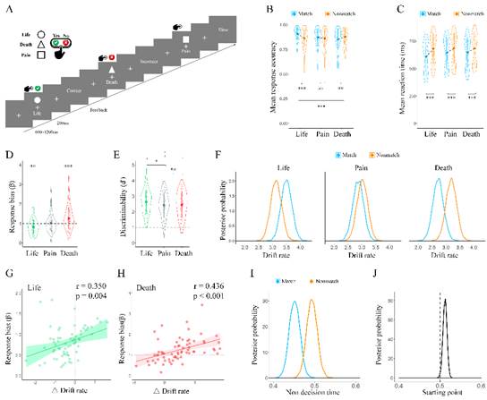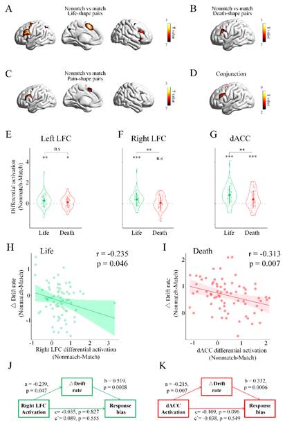 本研究采用词语-形状关联学习任务,将无意义的图形(譬如:三角形、圆形、正方形等)随机分配与生命、死亡和疼痛等关联。通过信号检测论和层级弥散模型对学习这些关联行为反应的分析,发现人们存在肯定生命配对和否定死亡配对的认知偏好,并且人们会加速采纳生命关联信息而延迟死亡相关的更新速度(图1)。功能磁共振结果进一步揭示右外侧额叶和背侧前扣带回两个脑区的活动分别与建立生命和死亡关联相关(图2)。 脑电图通道和脑磁图信号一致表明右侧额叶区域记录到的反映冲突调控的晚期神经信号(500-600ms)LPP会受到死亡信息的调控。关联学习结束后,在图形分辨任务中记录大脑对生命、死亡符号的动态神经过程,发现生命符号会增强右侧顶叶Alfa频段的神经震荡,而死亡符号则引发左侧顶叶至颞叶和楔前叶区域Beta频段活动的上升。本文分别揭示了高时间精度(毫秒)和高空间精度(毫米)学习生命和死亡符号及其表征的分离的神经机制。本论文最后发现,死亡关联学习的行为否认偏差可预测个体主观报告的生活满意度和抑郁水平,对理解死亡认知与心理健康的关系提供了神经科学依据。