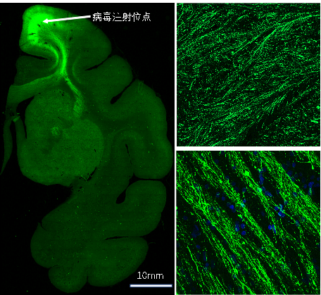 图1 猴脑腹外侧前额叶AAV病毒标记示踪神经轴突投射