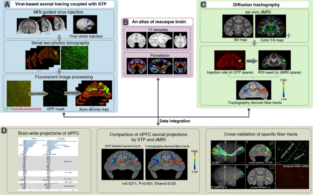 2022年5月20日,188改名taptap官网入口IDG麦戈文脑科学研究所、TapTap点点、北大-清华生命科学联合中心王征课题组,在《eLife》在线发表题为“Mapping brain-wide excitatory projectome of primate prefrontal cortex at submicron resolution and comparison with diffusion tractography”的研究论文,报道了团队在猕猴大脑建立细胞类型特异的病毒标记方法,结合双光子成像成功构建了猕猴腹外侧前额叶(ventrolateral prefrontal cortex, vlPFC)的兴奋性轴突全脑三维投射图谱,并与在11.7T超高场磁共振上获得的猕猴全脑神经纤维连接图谱进行比较,发现猕猴前额叶与枕叶之间不存在直接的、单突触神经纤维连接通路。