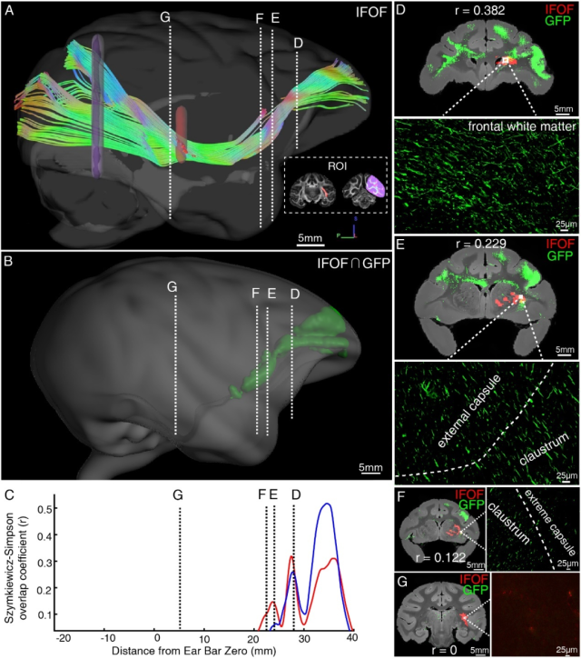 下额枕束(inferior fronto-occipital fasciculus, IFOF)是一条从额叶如腹外侧前额叶、眶额叶等区域出发,经外囊到达枕叶的神经纤维束。早在1909年哈佛大学医公司解剖学助理Curran解剖人脑白质纤维时就已发现(J Comp Neurol Psychology, 1909),但猕猴大脑的下额枕束是否存在始终没有定论。研究团队先利用扩散磁共振成像数据重建了下额枕束的投射路径,然后与病毒标记的荧光图像数据相比,发现腹外侧前额叶发出的兴奋性轴突只在前半脑与下额枕束存在较大的重合,随后大部终止于颞上回区域,但下额枕束则继续投射到枕叶部分(图2)。此结果揭示猕猴腹外侧前额叶与枕叶之间不存在直接的、单突触神经纤维连接,利用扩散磁共振成像技术观测到的下额枕束可能是一条间接、跨突触的神经通路,为解析领域内的重大争议问题提供了新的实验证据。此外,本研究也为开展猕猴介观神经连接图谱研究开辟了一条新路径。