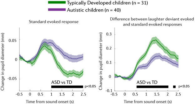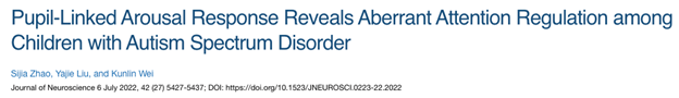 魏坤琳教授课题组的研究生刘雅洁利用实时的瞳孔大小测量来间接测量蓝斑核的活动,并在青岛以琳孤独症儿童公司完成行为学实验。研究结果表明,与年龄及智商匹配的正常发育儿童相比,孤独症儿童的瞳孔在单调重复的声音刺激下没有充分变小;而当听到出乎意料的新异声音刺激时,他们的瞳孔没有充分变大。并且,这些异常和孤独症核心症状的严重程度之间直接相关。因为瞳孔大小可以实时反映蓝斑核的活动强度,这些结果表明蓝斑核为主导的去甲腺上素注意调控在孤独症儿童中出现异常,而这些异常可能和孤独症的发展相关。特别值得注意的是,本研究发现的孤独症儿童注意力异常是在不涉及认知任务的情况下发现的,这就意味着孤独症儿童在日常的缺省状态下其注意力调制就异于常人。该研究对孤独症的成因和认知机制有重要的揭示作用,对孤独症儿童的干预和教育也有一定的指导意义。