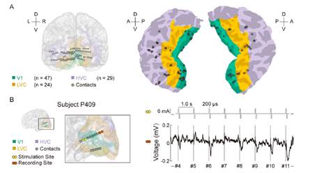 共有9名接受颅内立体脑电图(stereo-electroencephalogram, SEEG)监测的患者参与了本项研究。研究者首先向被试呈现视觉刺激,根据sEEG反应锁定了100个视觉响应的枕叶电极触点。随后,通过对以上电极施加电流刺激并记录诱发电位,研究者共获得165组显著的CCEP,包括V1-LVC和V1-HVC的前馈与反馈信号。