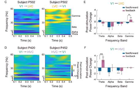 对电刺激后100 – 500 ms时间窗进行分析发现,V1-LVC和V1-HVC的CCEP信号展现出截然不同的时频特征。其中,在V1-LVC信号中,刺激诱发的能量变化主要集中在gamma频带,反馈方向的gamma显著强于前馈方向。对应地,在V1-HVC信号中,能量变化出现在30 Hz以下的低频频带,尤其存在显著的前馈theta抑制和反馈theta增强。值得注意的是,本研究的电刺激没有诱发被试的主观视觉体验,因此,上述结果可能反映阈限下的神经活动特性,其背后的神经机制还有待进一步研究探讨。