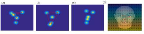 图1. (A)(B)(C)为眼动空间相似性计算。注视模式转为注视热图并向量化后,求两两向量之间的斯皮尔曼相关。该方法计算的相似程度与人类直觉非常相似:A和B之间的相关系数为0.82,A和C为0.64。但是,即使A和B整体注视的空间位置相似,它们产生的时间过程可以非常不同(见A和B中注视点产生的时间过程)。(D) 为基于扫描路径(scanpath)的眼动相似性。整张面孔刺激被分割成许多小矩形并被赋予不同的字母。基于此,每个注视序列被重新编码。比如示例中的注视序列被编码为字符串gO iB jM lL。在这个字符串中,既包含眼动的空间信息(不同的字符串代表不同空间位置),也包含时间信息(字母的排列顺序)。扫描路径相似性计算简化为比较不同字符串的相似性。我们使用基因研究中经常使用的Needleman–Wunsch algorithm (Needleman & Wunsch, 1970)计算字符串的相似性。