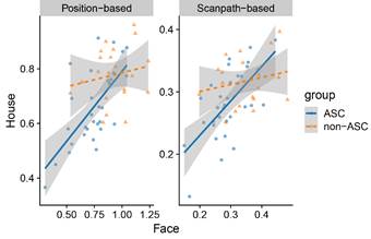 图2. 不同任务下,孤独症儿童和健康儿童加工面孔和房屋时的相似性程度。