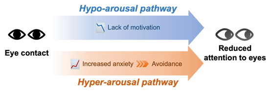 注:在过低唤醒通路中,孤独症个体表现出社会动机和社会兴趣的减弱,导致他们对眼睛的注意减少(社会动机理论;Chevallier et al.,2012a)。在过高唤醒通路中,眼神接触会引起孤独症个体的过高唤醒和极度焦虑,然后他们会避免看眼睛以减少紧张和不适(眼睛回避假说;Tanaka & Sung, 2016)。