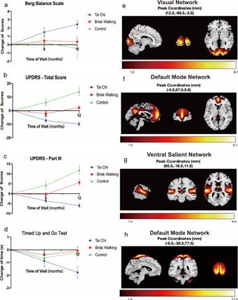 本研究招募了95名早期帕金森病患者,随机分配到太极、快步走和对照组,进行了为期一年的太极拳训练或运动干预,期间分别采用Berg平衡量表(BBS)、统一帕金森病评定量表(UPDRS)、起立-行走计时测试(TUG)和3D步态分析评估了平衡性、运动症状和步态,并进行磁共振成像扫描和血液检测。与对照组相比,结果发现太极拳组的参与者在运动症状、步态和平衡性方面均有改善(下图a-d),且太极拳对平衡性和步态的改善也显著优于快步走训练。随后,系统性分析功能磁共振成像和多种血液生物标志物测试(包括细胞因子、代谢组学和HIP2 mRNA表达)数据,进一步揭示太极拳对平衡能力的改善与视觉网络的增强相关,运动症状的改善则与默认模式网络的增强有关(下图e-h)。