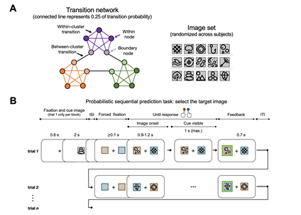 为了研究这一问题及其脑机制,研究者设计了一个新颖的序列预测实验范式,并记录高时间分辨率的脑电活动。15幅随机图片(图1A,右)被选取进而嵌入到一个社区网络结构(图1A,左),图片间的概率转移关系由它们在网络中的相互关系决定。我们招募了人类受试来完成该图片预测任务(图1B):他们观看图片流,预测下一幅图片是什么,并通过反馈来进行学习。换句话说,受试从来没有见过该社区网络结构,但如果他们能够成功完成该预测任务,则表明他们已经学会了这些图片间的关系,即在脑中形成了该抽象的社区网络结构。