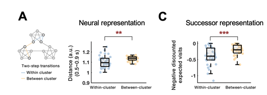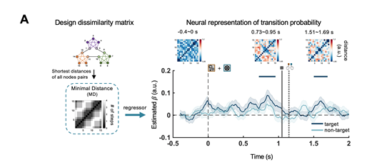 综上所述,罗欢和张航课题组结合了行为、神经、计算模型多种手段揭示了人脑从连续图片流中抽取和学习其背后的“抽象”关系网络,并进而从该低阶转移概率中建立高阶统计结构(簇内压缩和簇间远离)的神经机制和计算机理。