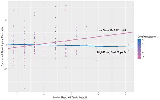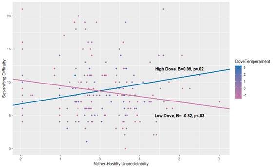 结果发现祖传线索与统计学习两个维度的不可预测性与青少年的机能发展有密切的联系,并与青少年的气质相互作用,影响青少年发展。值得注意的是,祖传线索与统计学习两个维度的环境不可预测性通过不同的途径发挥作用:前者与青少年温和性气质(Dove temperament)相互作用时,仅影响迷走神经应激(vagal stress reactivity)反应性。当温和性气质较弱的青少年处在更不可预测的环境中时,他们的迷走神经应激反应降低。对温和性气质高的青少年,迷走神经应激反应不受祖先线索不可预测性的影响。