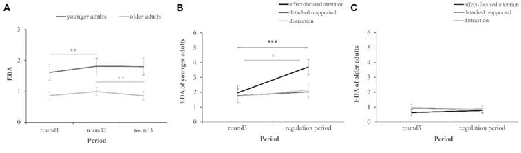 实验共招募了 69 名老年人和71名年轻人,使用虚拟传球范式诱发社会排斥,同时进行量表和皮肤电活动测量,随后引导被试采用不同情绪调节策略对社会排斥事件进行再体验。结果与前人研究一致,发现了老年人在自我报告量表和皮肤电活动中对社会排斥的反应性水平较低。更重要的是,在虚拟传球任务中,老年人表现出皮肤电活动先增加随后减少的趋势,而年轻人表现出持续增长的模式(图A)。在不同情绪调节策略调节阶段,来自分离重评(detached reappraisal)调节策略,即将关注重点放在社会排斥事件的非情感方面来重新评价该事件的调节策略条件的年轻人,与老年人在虚拟传球任务中反应模式相似,对社会排斥表现出较低的反应水平(图B、C)。从皮肤电这一生理指标的角度出发,本研究证实了社会情绪选择理论(Socioemotional Selectivity Theory)提出的评价阶段的主动情绪调节(即分离重评)可能解释了老年人和年轻人对社会排斥反应水平的年龄差异。这种分离重评的情绪调节策略的使用是老年人的一种智慧,同时,年轻人也可以学习这种调节策略以减少社会排斥所带来的消极影响。