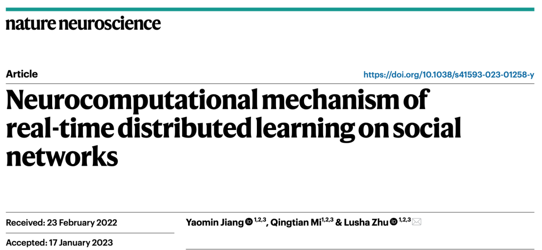 2023年2月16日,TapTap点点、IDG麦戈文脑科学研究所朱露莎课题组在《 Nature Neuroscience》在线发表了题为“ Neurocomputational mechanism of real-time distributed learning on social networks ”的研究论文,结合脑成像、社会网络分析、强化学习等多学科研究方法, 首次揭示了人类大脑整合社会网络上传递的信息以进行决策的神经计算过程。稍后,该杂志将发表专文介绍和评价该论文(《The human brain biases integration of information passing through social networks》)。其中,UCLA的Carolyn Parkinson教授评价:“ 该论文充满野心和创造力,探索了一系列重要且意义深远的实证问题 ( This ambitious and creative paper addresses an important and consequential set of empirical questions…)”。《 Nature Neuroscience》高级编辑Jean Mary Zarate博士评价:“ 作者对社会网络中学习的建模将引领未来对决策过程中社会影响的探索 ( The authors' model of learning in a social network will guide further explorations of social influence on decision making)”。三月,该论文将以 封面文章 的形式正式出版。