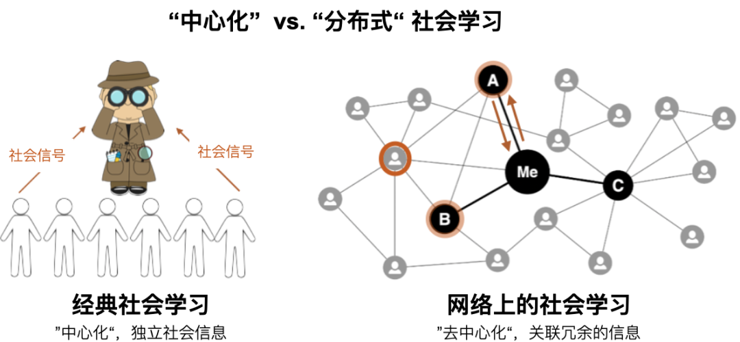 这是一个“去中心化”或称“分布式”的社会环境。在传统的“中心化”决策中,决策者处理的是来自不同渠道、但相互独立的社会信息(类似于体操比赛中汇总不同裁判的打分;图1左)。该情景下,大脑可以像统计学家一样,准确高效地整合信息。然而,在“去中心化”的网络中,每个个体在影响他人的同时也受到他人的影响(图1右),信息沿着网络连接来回流动,不同节点传递的信息可能高度关联、重复冗余、有着不同且难以判断的信息量,使正确整合这些信息在计算和认知上非常困难。