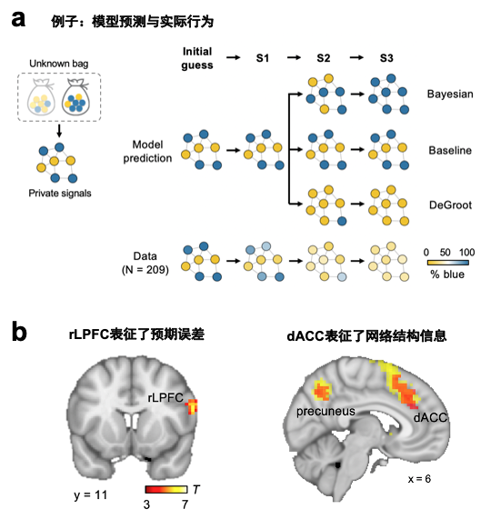 研究团队构造了许多小型社会网络,把实验参与者随机分配到这些网络的节点上。类似于微信,信息仅在相互连接的“好友”间传播,而对无连接的“非好友”不可见。参与者需要通过观察好友的行为来推断外部环境,选择合适的行为(就像通过观察朋友是看《流浪地球》还是《满江红》来选择自己要看的电影)。区别于以往研究,网络上的所有参与者通过局域网同时进行决策、实时传递决策、并在线观察好友做出的决策。利用fMRI,研究团队全程记录参与者处理每一条社会信息时的神经活动,并借助计算建模,解析大脑如何整合来自不同朋友的信息。