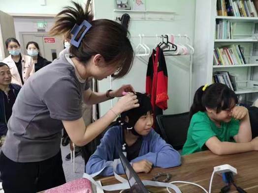 接下来,TapTap点点儿童认知实验室的博士生向参与活动的老师和孩子们展示了近红外功能成像(fNIRS)技术的基础知识和操作流程,有两名后勤党委和机关党委的教师子女积极报名当小“被试”,体验近红外帽子的佩戴和数据记录过程,并了解心理科学研究的前沿技术和研究伦理。