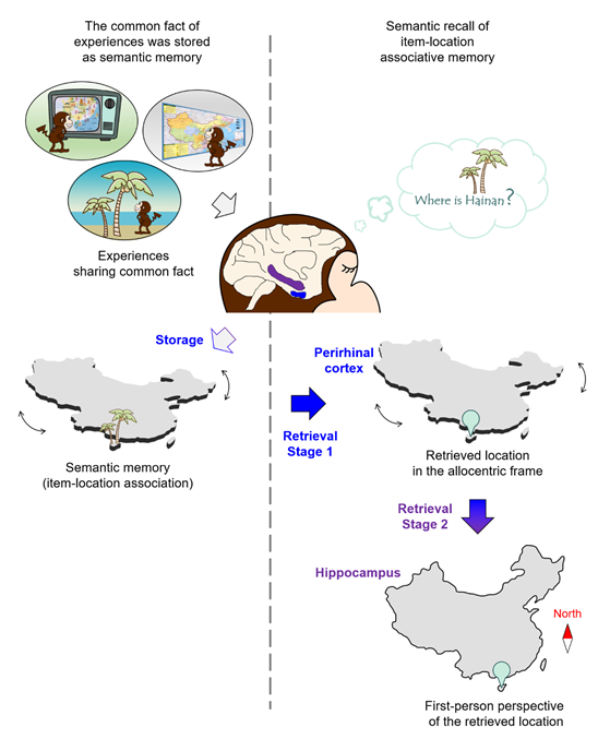 该研究聚焦于大脑如何提取和表征空间语义记忆。语义记忆指对一般事实性知识的记忆,与特殊的地点、时间无关。因此,语义记忆一般以异我中心参照系(allocentric reference frame)方式进行存储。这与包含特定的事件、时间、地点信息的情景记忆(episodic memory)正好相反,情景记忆一般以自我中心参照系(egocentric reference frame)或第一人称视角(first-person perspective)进行表征。然而,我们在回忆与空间有关的语义记忆时,也会使用第一人称视角对异我中心的空间信息进行心理表征。例如,我现在问你“海南在哪里”,你的脑海中可能会浮现出“下边”(图1)。过去的研究认为,鼻周皮质负责加工物体信息,海马旁回负责加工空间信息,海马则负责将物体和空间联系起来(Eichenbaum et al., 2007)。另外,标准巩固理论认为,海马对记忆的编码至关重要,但却不参与语义记忆的提取(Barry and Maguire, 2019)。那么,什么脑区负责提取包含物体和空间因素的语义记忆信息呢?