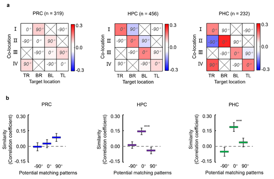 作者在猕猴执行任务的过程中,使用胞外电生理技术记录了内侧颞叶中的海马区、鼻周皮质、海马旁回、以及腹侧视觉通路的终端TE区这4个脑区的电活动。通过分析物体线索呈现后的神经元活动规律发现,物体关联的方位信号只出现在内侧颞叶的亚分区,而TE中未发现(图2b)。并且方位记忆信号首先出现在鼻周皮质,随后是海马和海马旁回(图2c-d)。接着,作者进一步分析了上述方位记忆信号在不同脑区的表征模式(图3)。结果表明,海马和海马旁回中的方位记忆表征与猕猴所看到的外部空间有正相关关系,说明这两个脑区以第一人称视角或自我中心参照系进行方位记忆的表征。而鼻周皮质中的方位记忆表征则与外部空间无关。