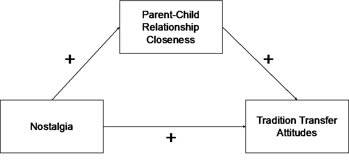 这项研究从心理学的视角出发,提出怀旧——对过去的眷恋和向往——可能是传统传承的促进因素。以往研究发现,怀旧是一种社会性情绪,可以增进人与人之间的连结,比如增进伴侣间的亲密度,增进个体与所爱之人的连结感,甚至增进个体与外群体的连结。基于怀旧的社会性属性,本研究假设,怀旧也可能增加父母感知到的亲子关系亲密度。当感知到更高的亲子亲密度,父母可能更加感到有责任传承传统、更愿意和孩子分享自己的记忆和价值观,以及更愿意和孩子有共享的体验和记忆,故而更愿意进行传统传承。