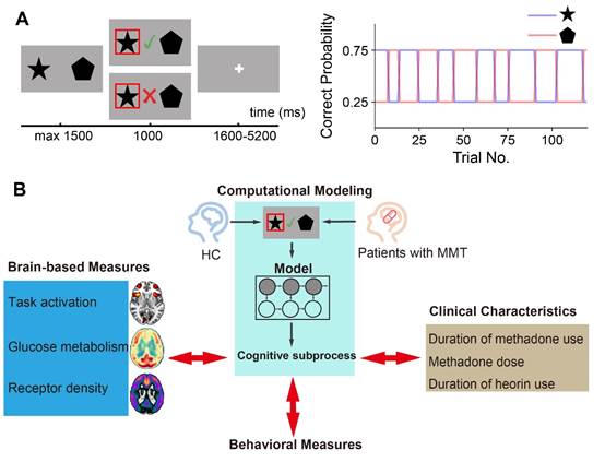 了解个体的冲动特质通常借助于临床访问量表,这难以避免主观判断偏差,且很难量化比较抽象的心理学概念。王征团队成员积极发展计算精神病学(computational psychiatry)模型方法(Huys et al., 2016),探究接受美沙酮维持治疗的海洛因成瘾个体冲动决策受损的认知子过程及其生物学基础。研究团队招募了37名长期接受美沙酮治疗的海洛因成瘾患者和33名健康对照被试参与概率反转学习任务时的任务态功能性磁共振成像数据,同时使用氟-18-氟脱氧葡萄糖正电子发射断层扫描测量了被试的脑部在静息状态下的葡萄糖代谢水平。在概率反转学习任务范式中,受试者必须在响应旧条件和转向新条件之间进行选择,在没有充分证据表明奖励条件发生变化的前提下过度频繁地切换选择表征冲动决策偏好。利用认知计算建模,可定量探究与冲动相关的认知子过程缺陷,图1展示了整个课题设计逻辑思路和实验流程。