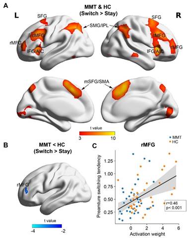 图2. 美沙酮维持治疗患者脑部与冲动决策相关的功能激活受损