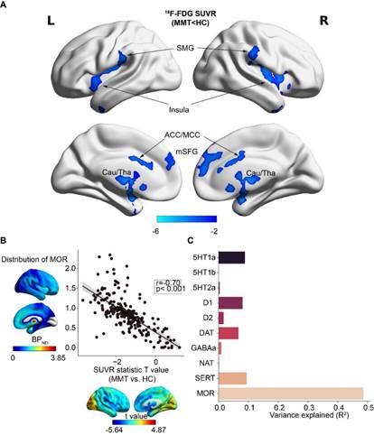 图3. 美沙酮维持治疗患者脑中的葡萄糖代谢异常与MOR受体的全脑空间分布有关