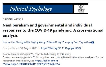 Liu, Y.+, Wu, Z.+, Wang, Y., Dong, Z., Sun, Z. & Gan , Y*. (in press). Neoliberalism and Governmental and Individual Responses to the COVID-19 Pandemic: A Cross-national Analysis. Political Psychology. https://doi.org/10.1111/pops.12927