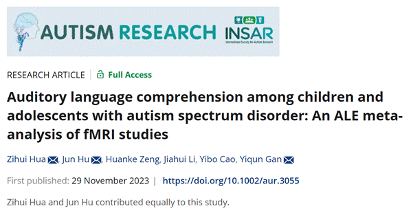 Hua, Z#., Hu, J#., Zeng, H., Li, J., Cao, Y., & Gan, Y. (2023). Auditory language comprehension among children and adolescents with autism spectrum disorder: An ALE meta-analysis of fMRI studies. Autism Research. https://doi.org/10.1002/aur.3055