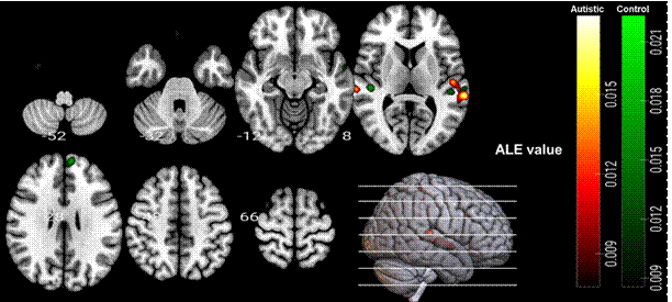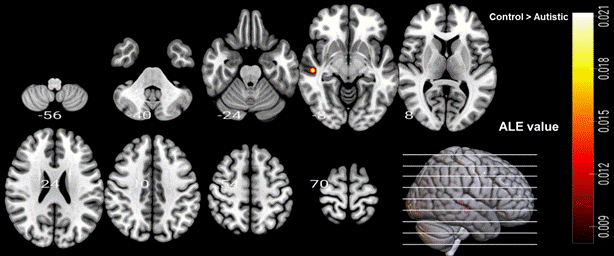 图3. 组间分析ALE结果(孤独症组 vs. 非孤独症组)