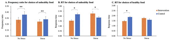 Fig 1. 二元食物选择任务中,干预和应激在反应时和正确率中的交互作用