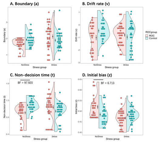 研究进一步通过HDDM,揭示了干预的起效机制。结果发现,在非决策时间(贝叶斯因子,BF=32.722)和初始偏差(BF=27.350)中,交互效应显著。具体而言,在无应激条件下,接受了干预的个体,相比对照组而言,有更短的非决策时间,初始偏差也更偏向健康食物(如图2)。同时,初始偏差的应激主效应显著(BF_stress = 36.207),应激下个体的初始偏差更偏向不健康食物。即,本研究验证了应激损害个体的健康饮食,发现ROC-T干预在应激和无应激条件下均促进了健康饮食,起效机制主要为非决策时间和初始偏差。