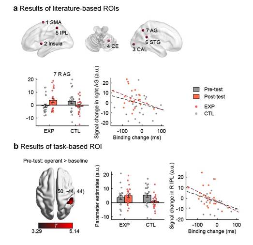 行为学上,实验组被试在虚拟现实训练期间利用虚拟手完成了一系列运动任务,他们的时间捆绑效应也在训练后得到增强(图1),证明虚拟现实训练增强了他们对虚拟手的施动感;而控制组被试在虚拟现实训练时没有看到虚拟手,他们在训练前后的时间捆绑效应也没有明变化。行为学结果证明了个体在实时控制虚拟肢体与环境进行运动交互后,其施动感可以迁移到虚拟肢体上,和实验室前述研究一致。