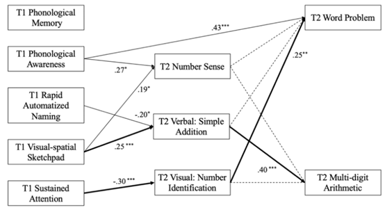 研究为序列设计,分别选择两批幼儿园大班儿童(共184名),追踪到三年级(130名)。研究测试了语音加工的三个子成分(语音意识,语音记忆与快速命名)和视觉空间注意、持续性注意。此外还测试了非符号数量比较、简单加法、数字识别、应用题解决与多位数计算。