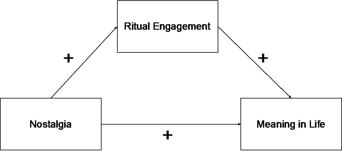 据此,本研究假设怀旧能够促进仪式参与,进而提升生命意义感。假设模型如下图所示。