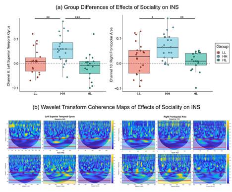 结果首先验证了高-高孤独症特质配对的被试的确会表现出更多非典型的社交行为,包括更少的眼神交流、对话轮次和情绪分享。然而,神经同步性分析发现,尽管高-高孤独症特质被试的行为表现与其他两组不同,他们在社交对话中仍然实现了较高的神经同步性,在左侧颞上回和右侧额极区,其同步性水平甚至同时高于高-低特质组和低-低特质组。同时,高-高孤独症特质被试对对话过程的主观评价也更好。