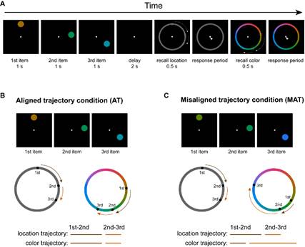 具体来说,三个不同颜色的圆盘顺序呈现在不同的空间位置,被试的任务是记住颜色序列以及空间位置序列,即需要记住两个不同维度信息的序列,并在回忆阶段,先重复空间位置序列,再重复颜色序列。研究团队操控了圆盘在颜色空间与位置空间中路径距离的一致性。如下图所示,在路径对齐条件(Aligned trajectory, AT), 颜色地图中1st 颜色到2nd颜色的距离等于空间地图中1st 位置到2nd 位置的距离,同时2nd 颜色到3rd颜色的距离也等于2nd 位置到3rd位置的距离。 而非对齐条件(Aligned trajectory, MAT)下,路径长度在两个维度之间不一致。