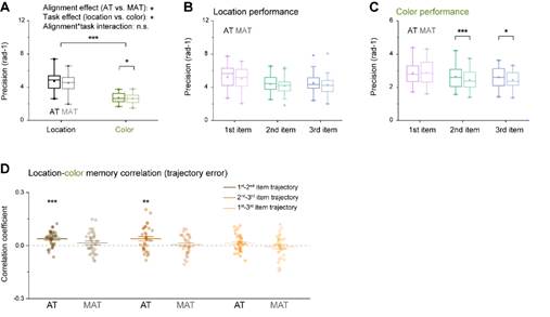 图2:行为表现。(ABC) 对于空间位置以及颜色的记忆精度。(D)路径记忆偏差在两维度之间的相关